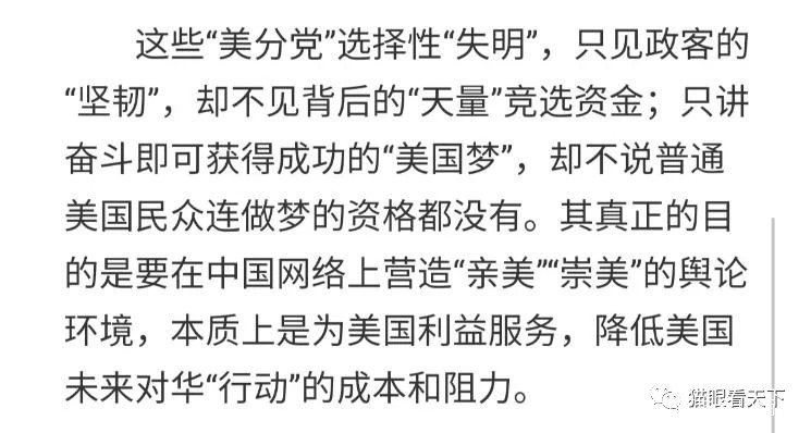 和人們習慣的標題黨完全不一樣,這篇網評標題只是一個相對中性的説法,而更大的信息量在其正文部分。尤其是在文中提及“崇美、跪美的公知大V”這一説法,令人耳目一新!