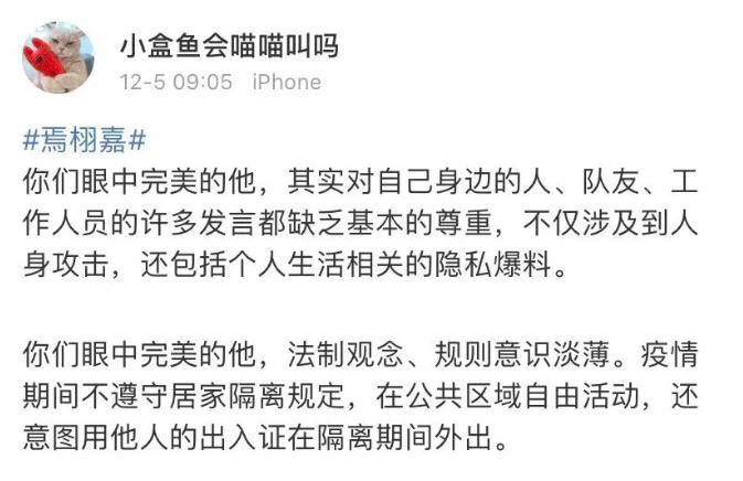 仍以焉栩嘉為例,他的形象崩塌基本過程如下:12月5日,小盒魚詳述了她和焉栩嘉的戀愛始末,稱自己被劈腿、以及遭遇了冷暴力,在這之後她還先後爆料了焉栩嘉對隊友、工作人員缺少尊重,法制觀念淡薄,疫情期間不按照規定隔離,女方代寫微博文案等諸多問題,條理清晰、證據確鑿也迅速取得了網友信任。