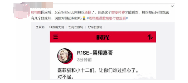 情感問題難以理清,另一則發佈在R1SE與粉絲溝通的fanclub軟件上的道歉,也再次將其送上了微博熱搜。“加菲貓和小十二們,讓你們難過擔心了,對不起”,很顯然這是一條針對粉絲的致歉,只是簡短的語言和需要付費的軟件屬性,也引發了網絡上的羣嘲,相關話題閲讀量突破6億。