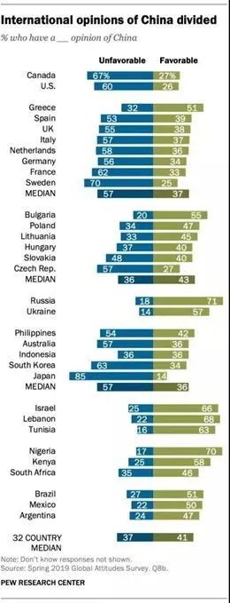2019年美國獨立調查機構皮尤研究中心公佈了全球對華態度調查結果。