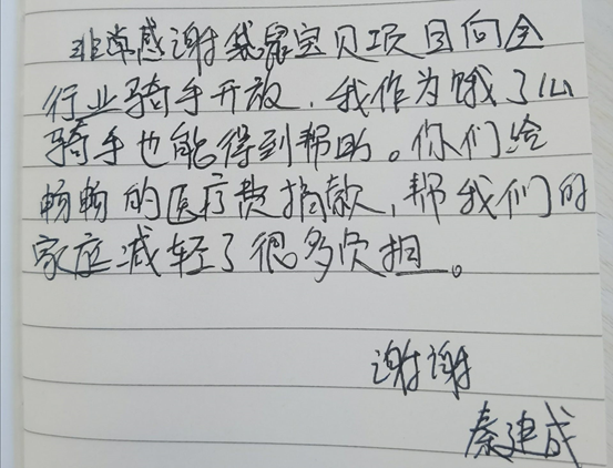達達騎手王詩軍的孩子,在2020年11月獲得資助,治療急性淋巴細胞白血病……