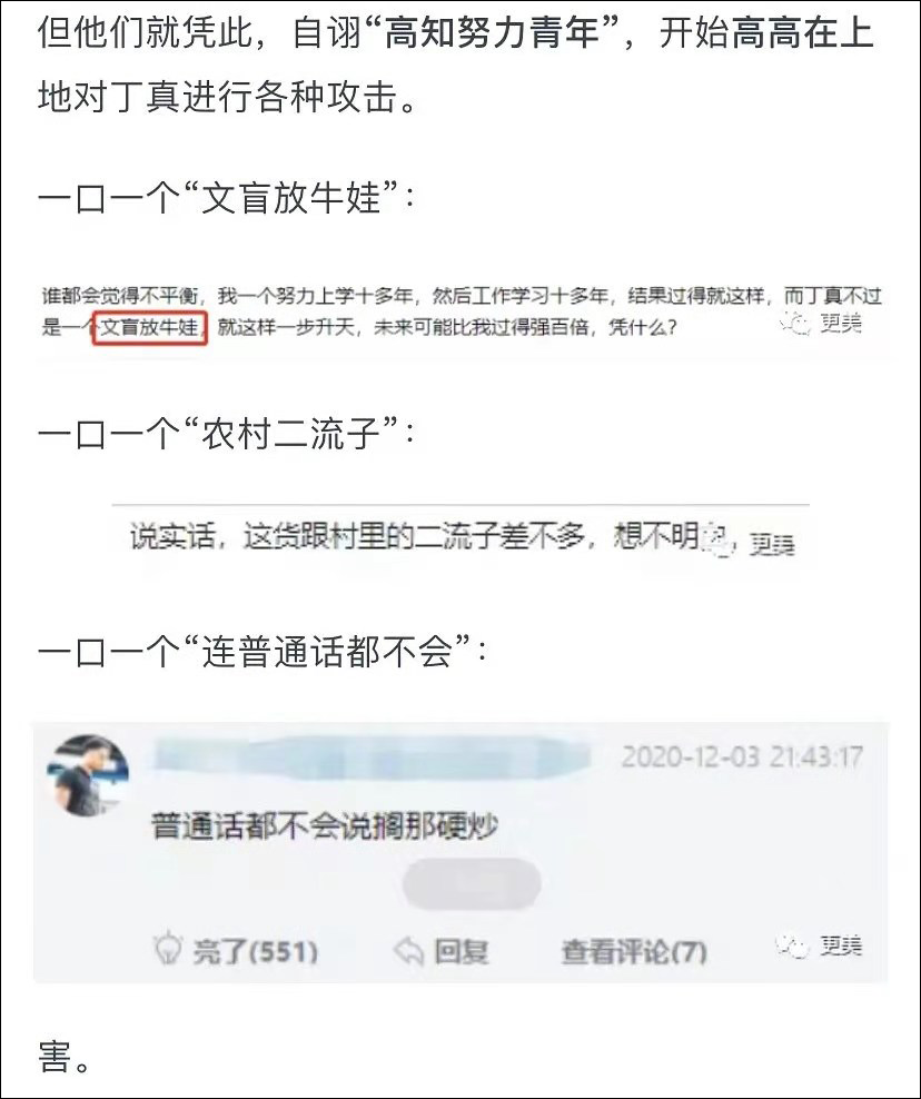 更有甚者,直接對丁真本人進行人身攻擊,稱其為“農村二流子”、“文盲放牛娃”。