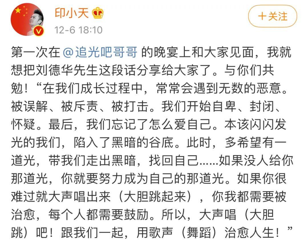 也許是聽到了網絡上諸多議論的聲音,印小天當晚發文,像是在回應那段被提及的昔日恩怨。
