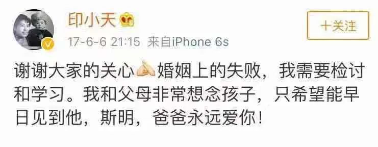勝訴後,妻子便帶着孩子消失了,印小天連孩子的面都沒能見到,只能在微博上訴説着想念。