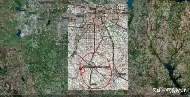 紅圈就是對撞機,注意上方達拉斯城市的大小。第一段環形低速加速器600米,第二段中能助推器10.8公里,第三段高能助推器10.8公里,最後一段是87.1公里的對撞環。
