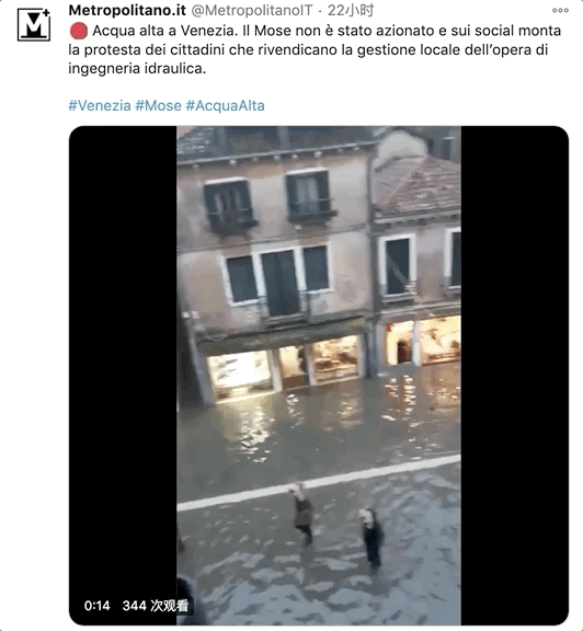 在10月初,威尼斯就首次部署了名為“MOSE”的旨在防止水位上升的人工堤壩保護系統。它由一個充滿水的沉箱網絡組成,包括在瀉洪入口處放置了78個堤壩,據説能夠在30分鐘內升起,形成一個能夠抵抗高於正常水位3米的水位上升的屏障。然而,週二由於錯誤預測水位峯值只有120釐米****,保護系統沒有被觸發。