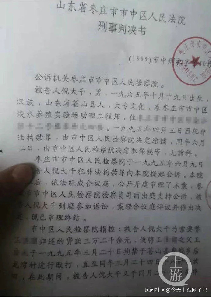 上游新聞12月9日報道,有網友反映稱,1995年,時任棗莊市市中區淡水養殖試驗場助理工程師的倪大千因犯非法拘禁罪獲刑二年,緩期三年執行。此後倪大千升任周村水庫管理處主任,2018年又升任至棗莊市市中區南水北調工程建設管理局總工程師。