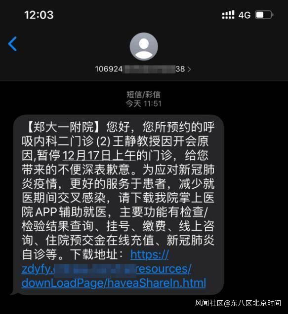 12月11日,鄭州一位市民透露,12月10日上午,他曾預約了一個12月17日上午王靜的門診,但是當天上午11時51分,醫院短信告知他:“王靜教授因開會原因,暫停12月17日上午的門診”。