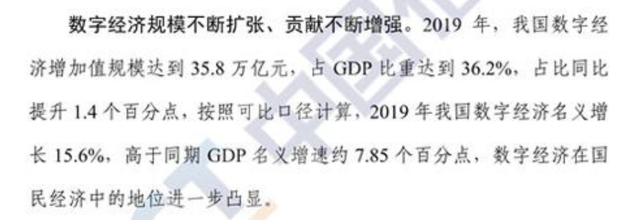 根據中國信通院發佈的《中國數字經濟發展白皮書(2020年)》顯示,2019年,我國數字經濟增加值規模達到35.8萬億元,佔GDP比重達到36.2%。