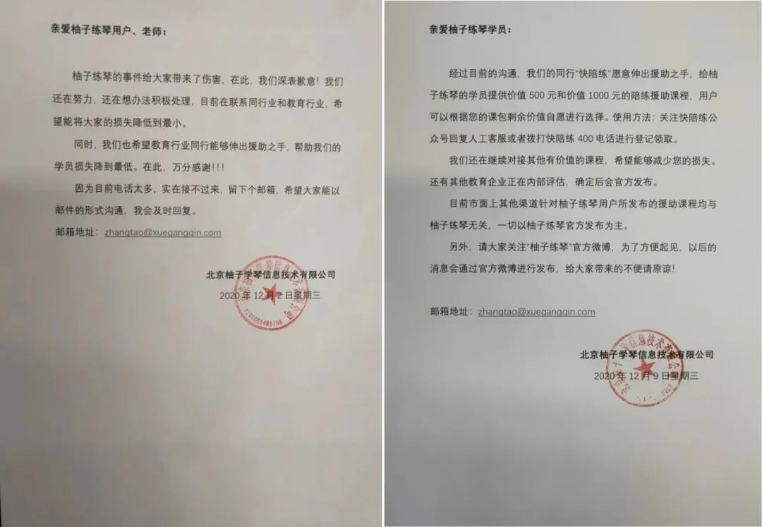 12月9日,柚子練琴進一步發佈進展,稱同行“快陪練”伸出援手,給柚子練琴的學員提供價值500元和1000元的陪練援助課程。還有其他教育企業正在內部評估,確定後會通過官方發佈。