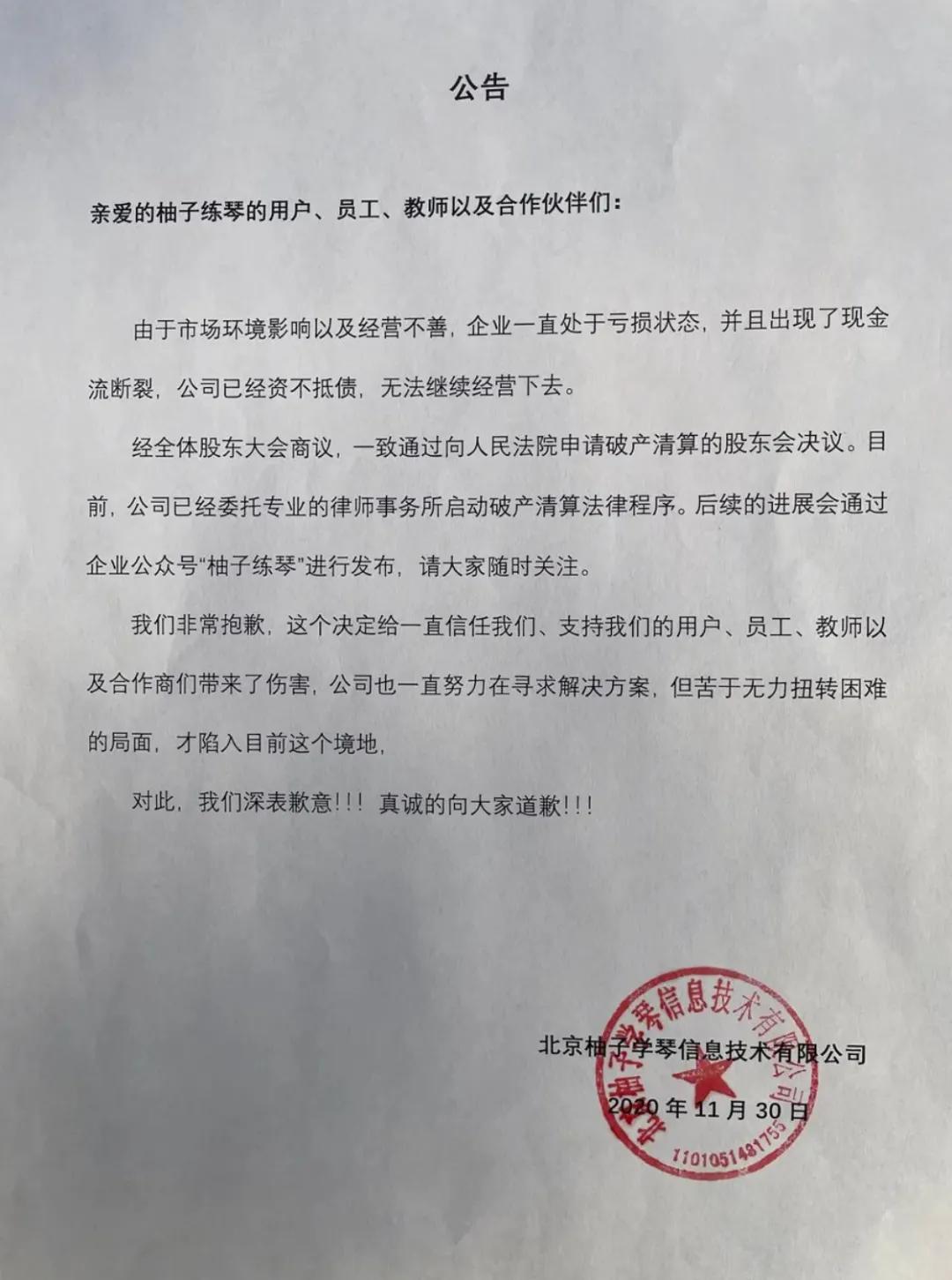 柚子練琴11月30日發佈的公告稱,由於市場環境影響以及經營不善,企業一直處於虧損狀態,並且出現了現金流斷裂,公司已資不抵債,無法繼續經營下去。經全體股東大會商議,一致通過向人民法院申請破產清算的股東會決議,公司已委託專業的律師事務所啓動破產清算法律程序。