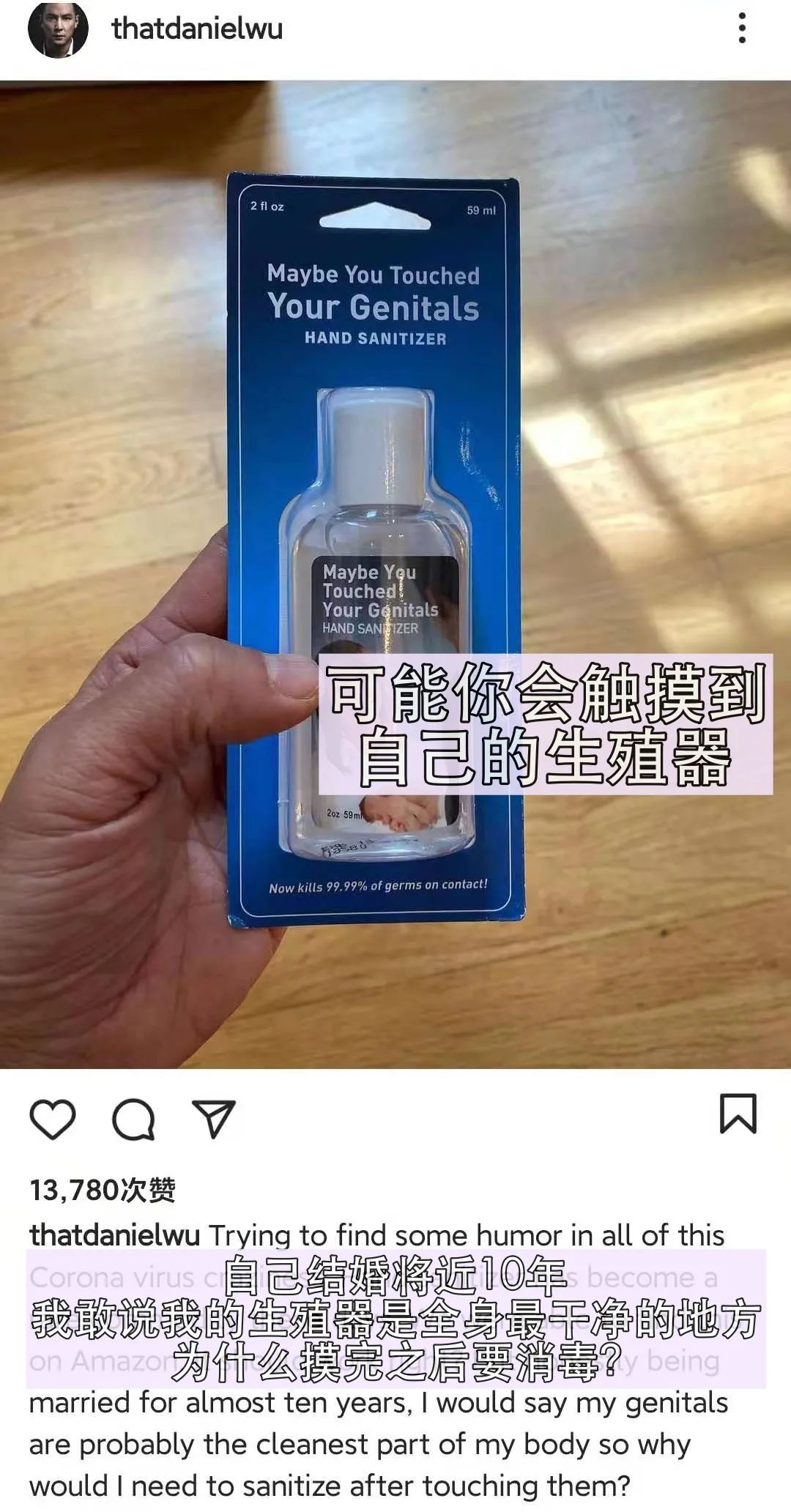 他發文稱:“自己結婚將近10年,我敢説我的生殖器是全身最乾淨的地方,為什麼摸完之後要消毒?”