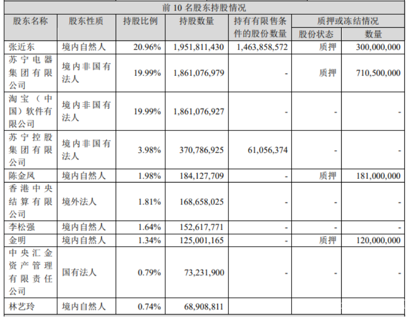 “據國家企業信用信息公示系統的披露,蘇寧控股集團股東張近東、張康陽及南京潤賢企業管理中心(有限合夥)已將公司全部股權出質給淘寶(中國)軟件有限公司。”