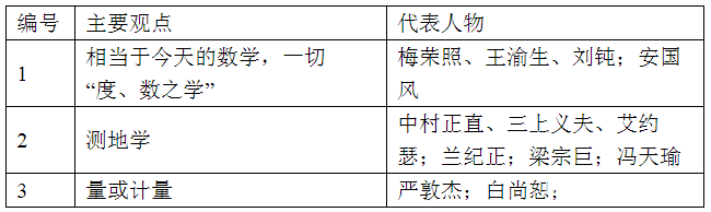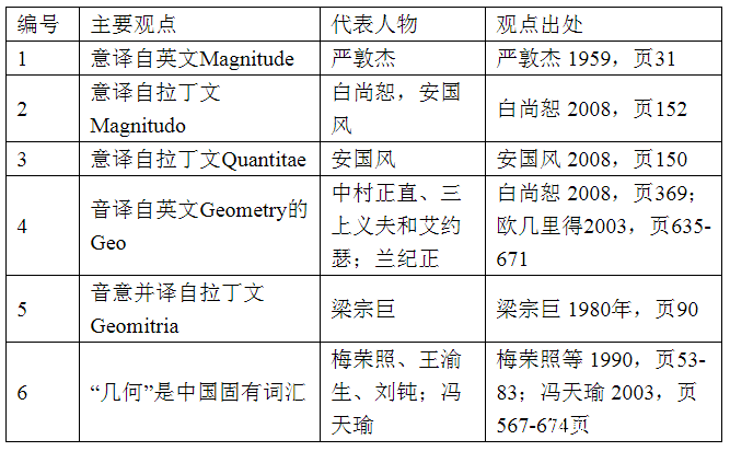 “幾何”一詞選自中文固有詞彙,大家的認識是一致的。“幾何”一詞所對應的西學詞彙,已有研究基本使之明朗了,即“幾何”一詞意譯自拉丁文Magnitudo和Quantitae,而不是音譯。但是,仍有個別不完全一致之處,本部分以綜述前人成果為主,並擬將其理順。