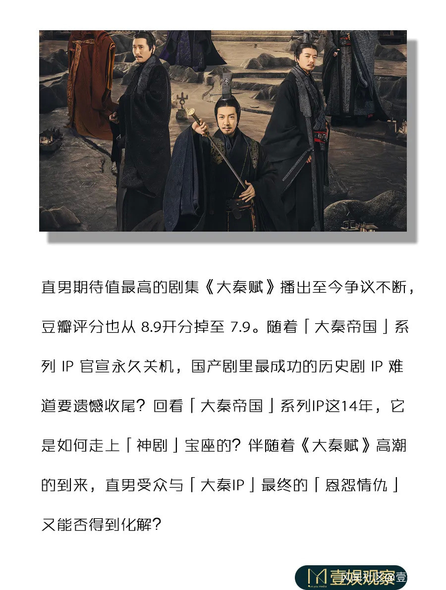 《大秦賦》豆瓣評分從8.9迅速跌至7.9,聚焦直男用户的虎撲值也從95分跌至92.4分。隨着“大秦帝國”系列IP官宣永久關機,《大秦賦》的爭議聲不斷高漲,橫跨14年創作週期、最成功的歷史劇IP難道就要在遺憾中收尾?回看這14年,“大秦帝國”系列如何在網絡上逐漸成為第一歷史劇IP?直男受眾又是如何將其推向“神劇”巔峯?