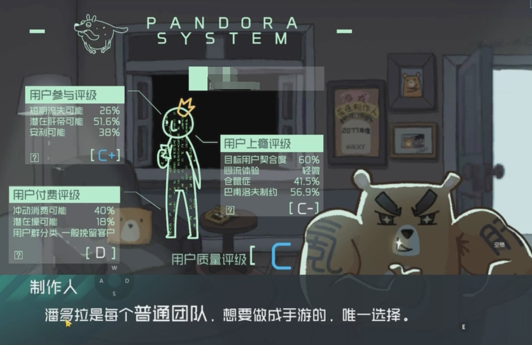帶着這樣的疑問進入遊戲,我發現關鍵在於遊戲中一個相當奇葩的設定——「潘多拉系統」。它會分析你的留存度、付費可能性等,並做出用户質量評級。你玩得越久、越投入、越上癮,評級就越高,這也是遊戲的唯一目的。