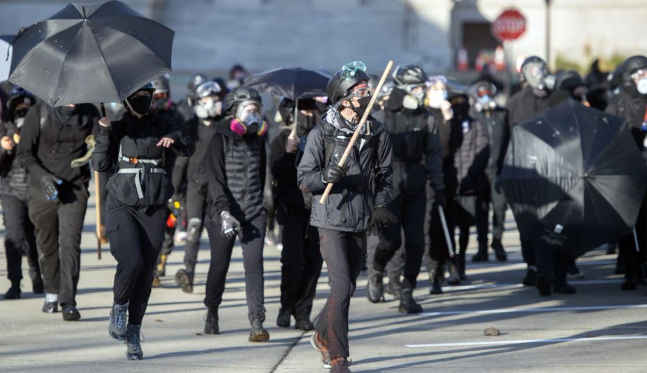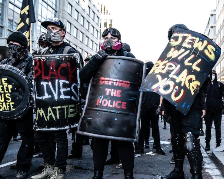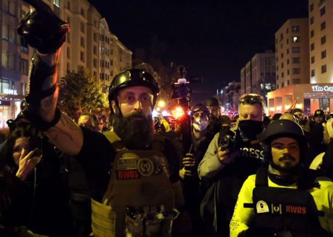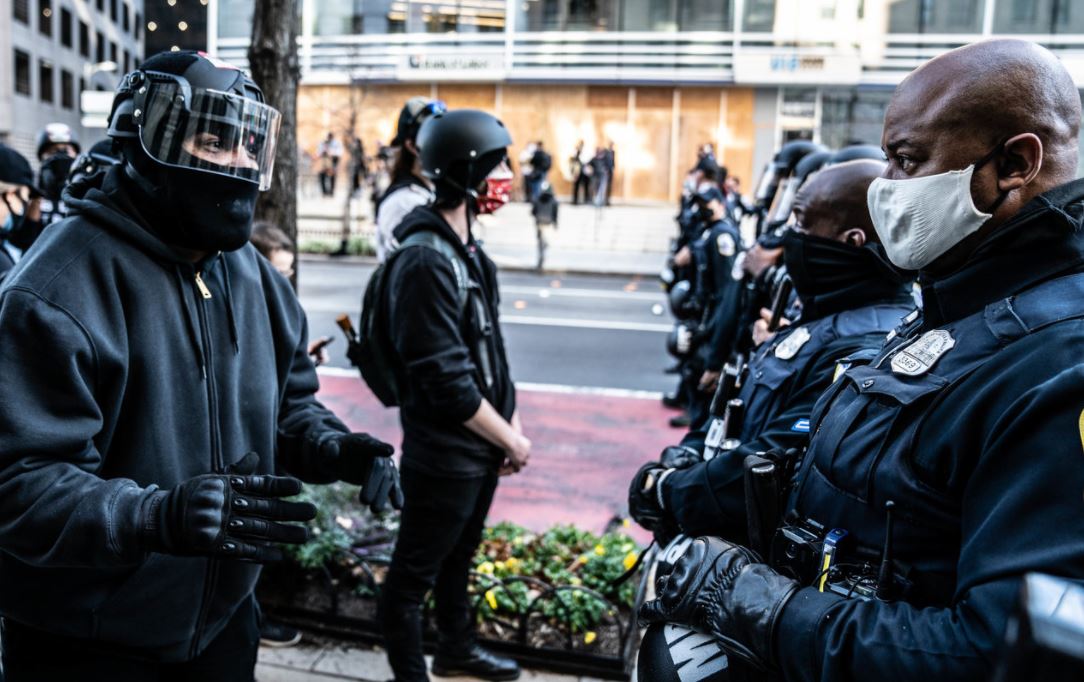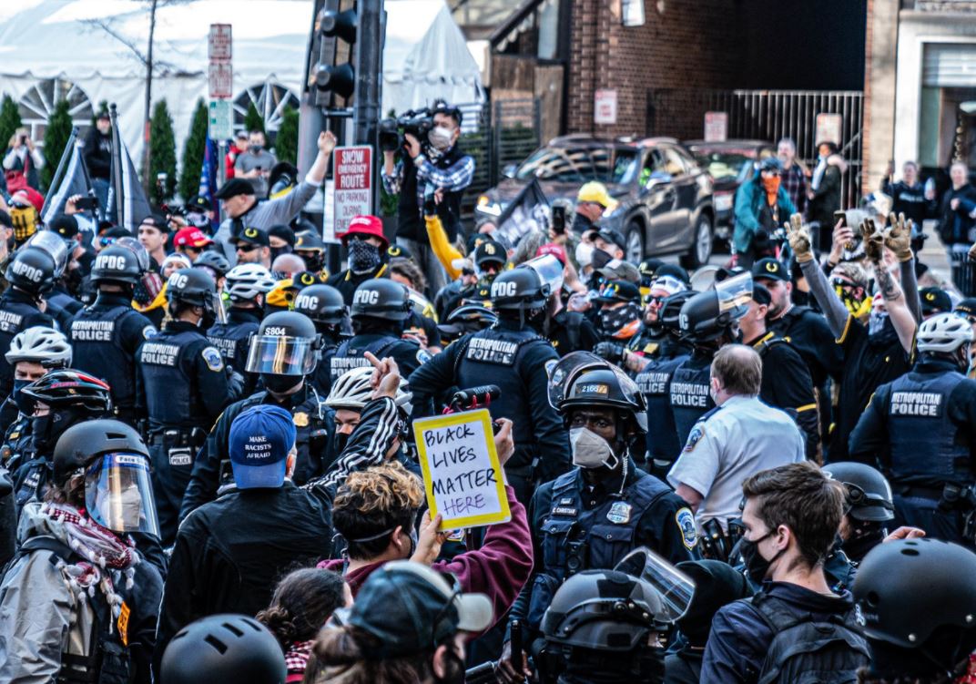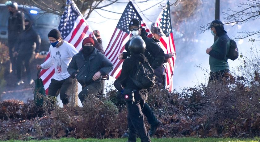 極端保守派組織“驕傲男孩”與警方交涉,圖源Reuters