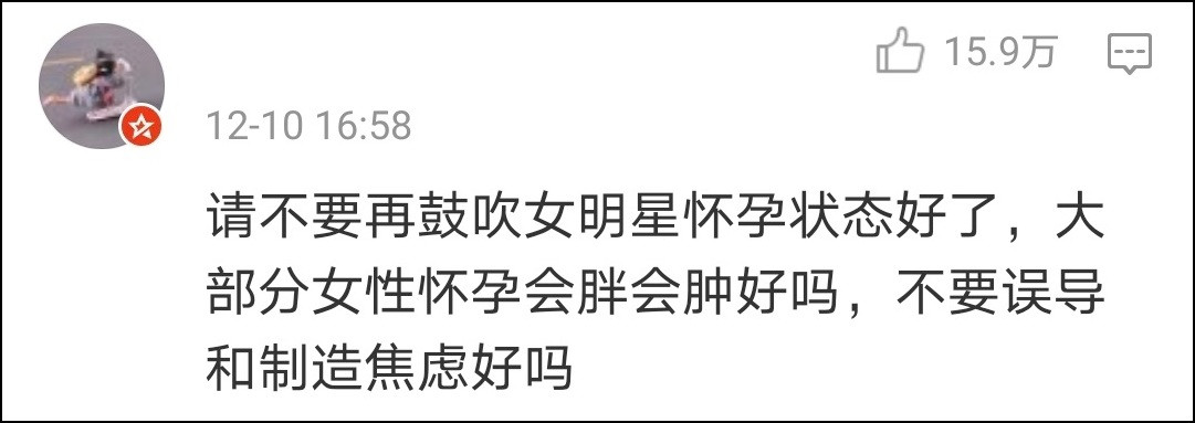 除了對相關微博表達“憤怒”的態度外,這些網友留言表示:請不要炒作女明星的孕期狀態了,大部分普通女性懷孕後都是會身材走樣、面容浮腫的,進行這樣的營銷根本是在販賣焦慮。