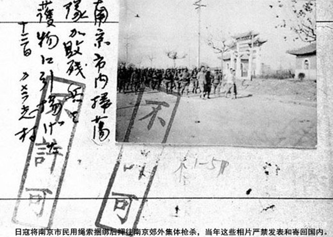 當時,日各新聞單位派到中國的隨軍記者拍攝的照片,日本當局規定,各新聞單位必須將每張照片加洗4張,送陸、海軍省、外務省審批,3張由上述三個單位留底保存外,1張退還各新聞單位,若退還照片蓋有“檢閲濟”印記則可發表,若蓋上“不許可”印記,則嚴禁發表,甚至嚴禁泄露。