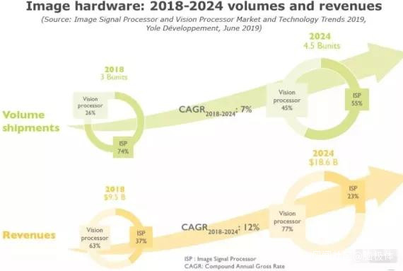 根據Yole的一份市場統計,VP芯片從2018年至2024年期間的複合年增長率(CAGR)高達18%,預計2024年將達到145億美元規模。同時,ISP芯片保持低速穩定增長態勢,2018年至2024年期間的複合年增長率僅為3%,預計2024年將達到42億美元規模。