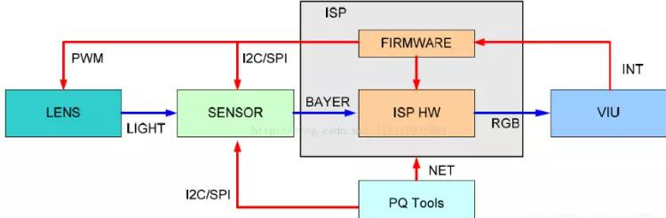 根據專業人士的介紹,ISP的具體處理流程是這樣:Lens 將光信號投射到sensor 的感光區域後,sensor經過光電轉換,將Bayer 格式的原始圖像送給ISP,ISP經過算法處理,輸出RGB空間域的圖像給後端的視頻採集單元。在這一過程中,ISP通過運行在其上的Firmware固件對ISP邏輯,從而對Lens 和sensor進行相應控制,進而完成自動光圈、自動曝光、自動白平衡等功能。其中,Firmware的運轉靠視頻採集單元的中斷驅動。PQ Tools工具通過網口或者串口完成對ISP 的在線圖像質量調節。