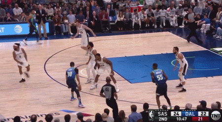 “五外”打法之二,是三人拉開後,後衞與波爾津吉斯擋拆二打二,通常也以投三分球結束。這個投三分的,可以是任何一個人,因為所有人都在三分線外,稱為“五外”。