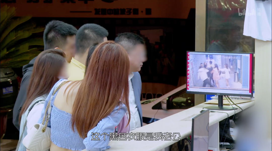 監控畫面中,一個穿着超短褲、露出一雙大長腿的女人掛在老公身上。