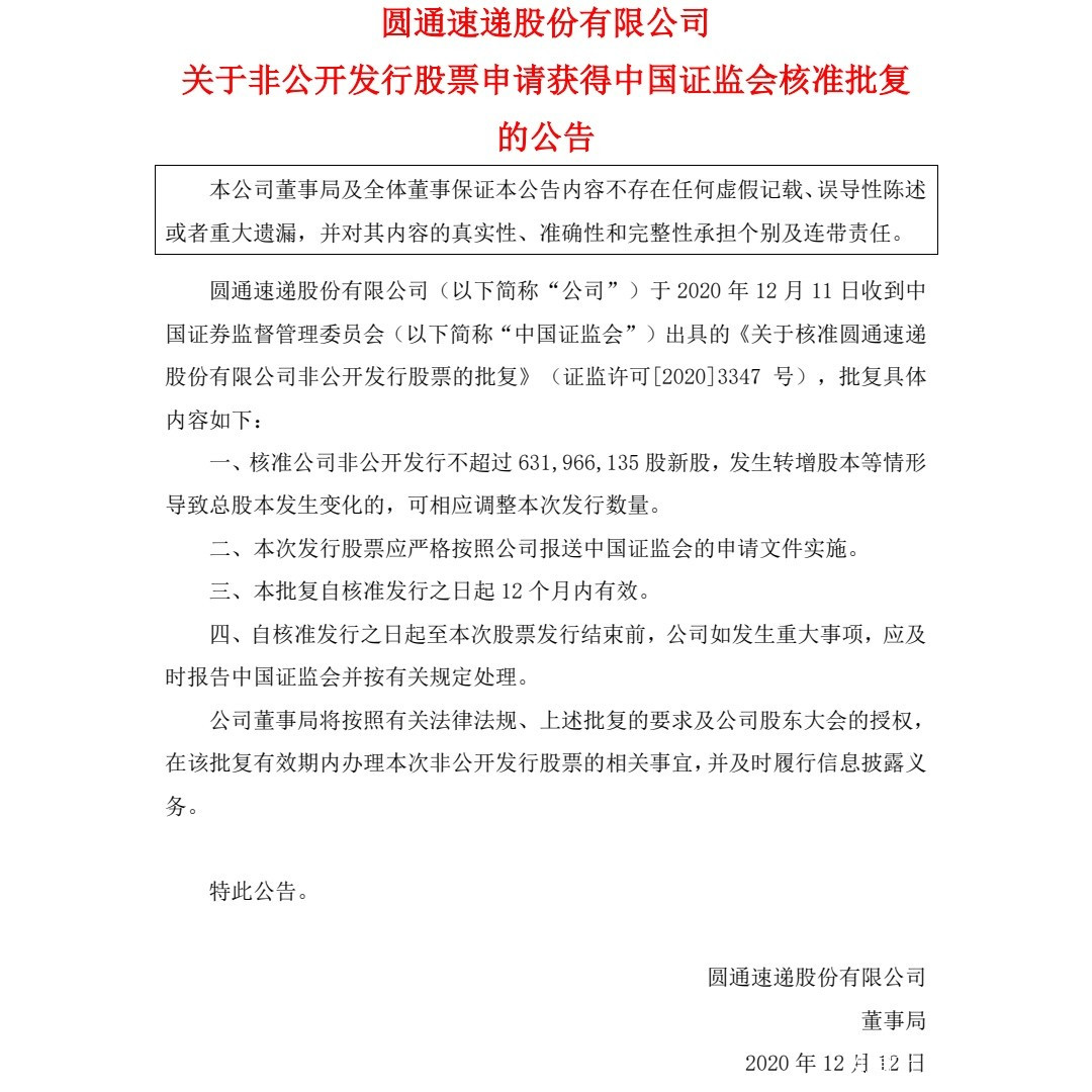 圓通速遞獲批非公開發行不超過6.32億股新股