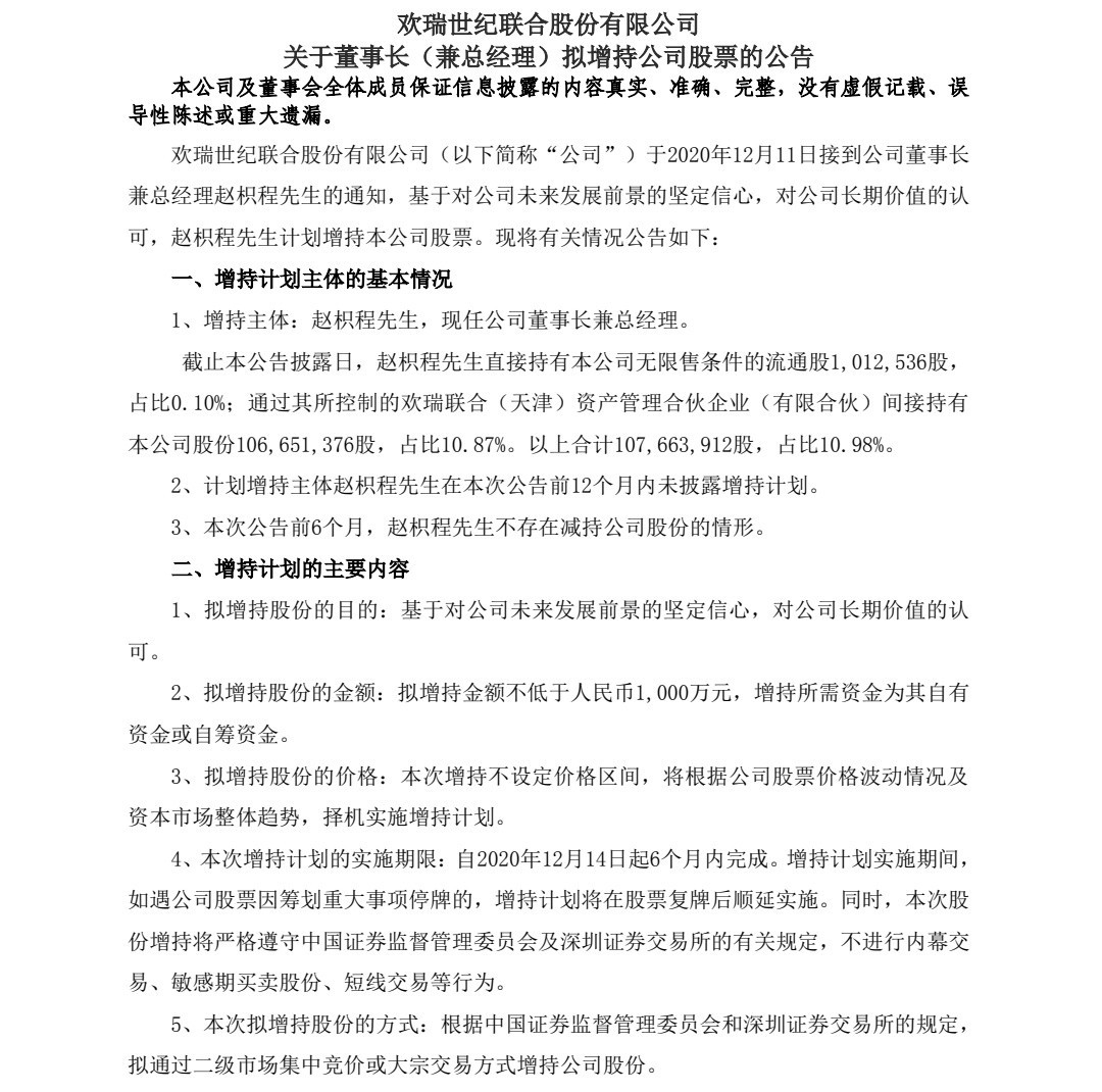 12月13日,歡瑞世紀發佈公告稱,公司董事長兼總經理趙枳程擬增持股份。擬增持股份的目的:基於對公司未來發展前景的堅定信心,對公司長期價值的認可。擬增持股份的金額:擬增持金額不低於人民幣1,000萬元,增持所需資金為其自有資金或自籌資金。擬增持股份的價格:本次增持不設定價格區間,將根據公司股票價格波動情況及資本市場整體趨勢,擇機實施增持計劃。本次增持計劃的實施期限:自2020年12月14日起6個月內完成。