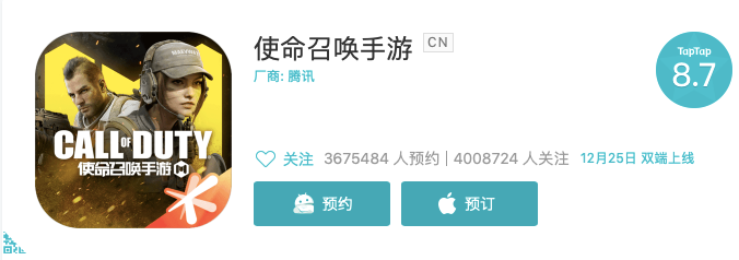同樣在國內市場,雖未上線,但《使命召喚手遊》的人氣居高不下。僅在TapTap和好遊快爆平台,遊戲預約量均超過300萬,評分接近9分。在《使命召喚手遊》官網,預約人數已突破了5000萬。