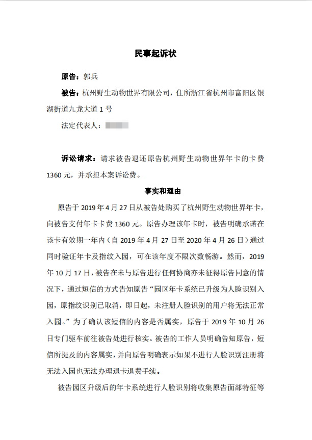 2019年10月,因為不忿野生動物世界強制遊客刷臉,浙江理工大學特聘副教授郭兵用一天時間準備了起訴狀,去往法院申請立案。