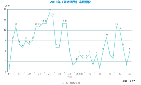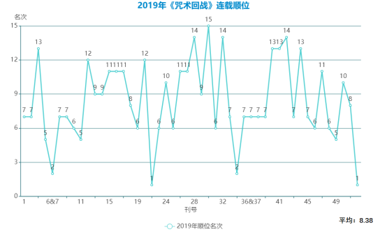 2019年,《咒術回戰》的平均順位為8.38,《鬼滅之刃》動畫開播全面爆發,《約定的夢幻島》《黑色四葉草》等台柱也還在連載,在眾多台柱的壓制下,《咒術回戰》還是繼續保持了中等偏上的水平。