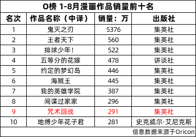 2020年O榜1-8月漫畫銷量,《咒術回戰》以291萬排在第九