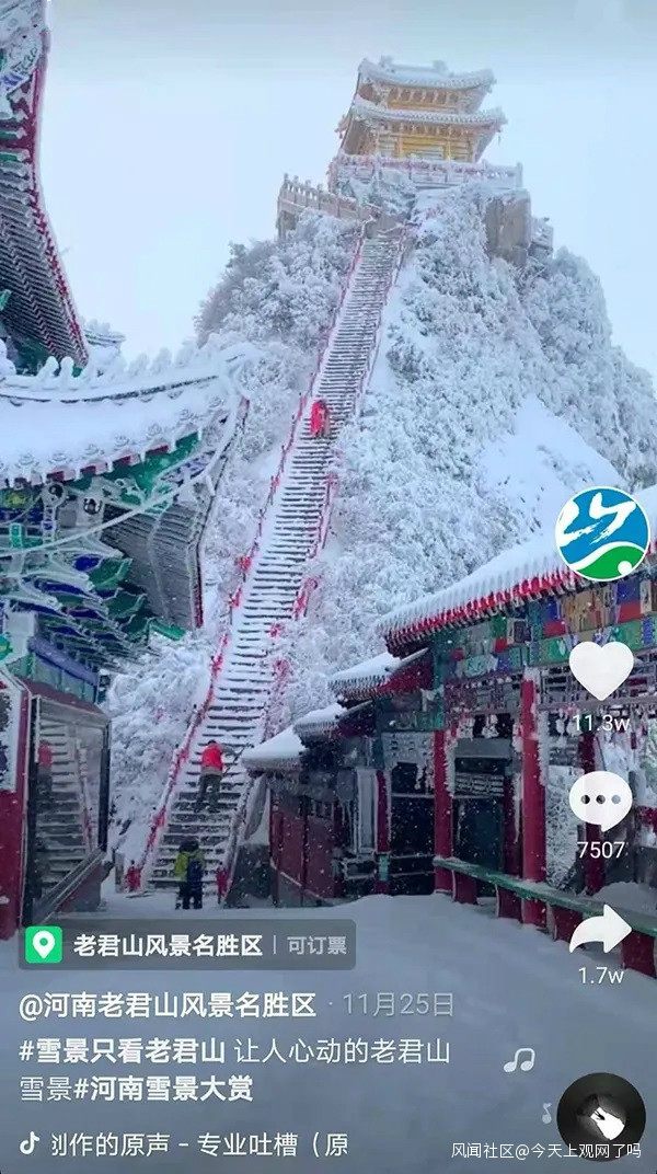 澎湃新聞注意到,一些展現老君山雪景的視頻日前在某短視頻平台上廣泛傳播。