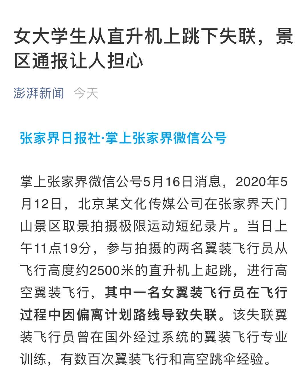 就算這位翼裝飛行員,真的是女大學生,那也不是這件事情的主要矛盾,無需強調,更別説她進行“翼裝飛行”,也不是“從直升機上跳下”。