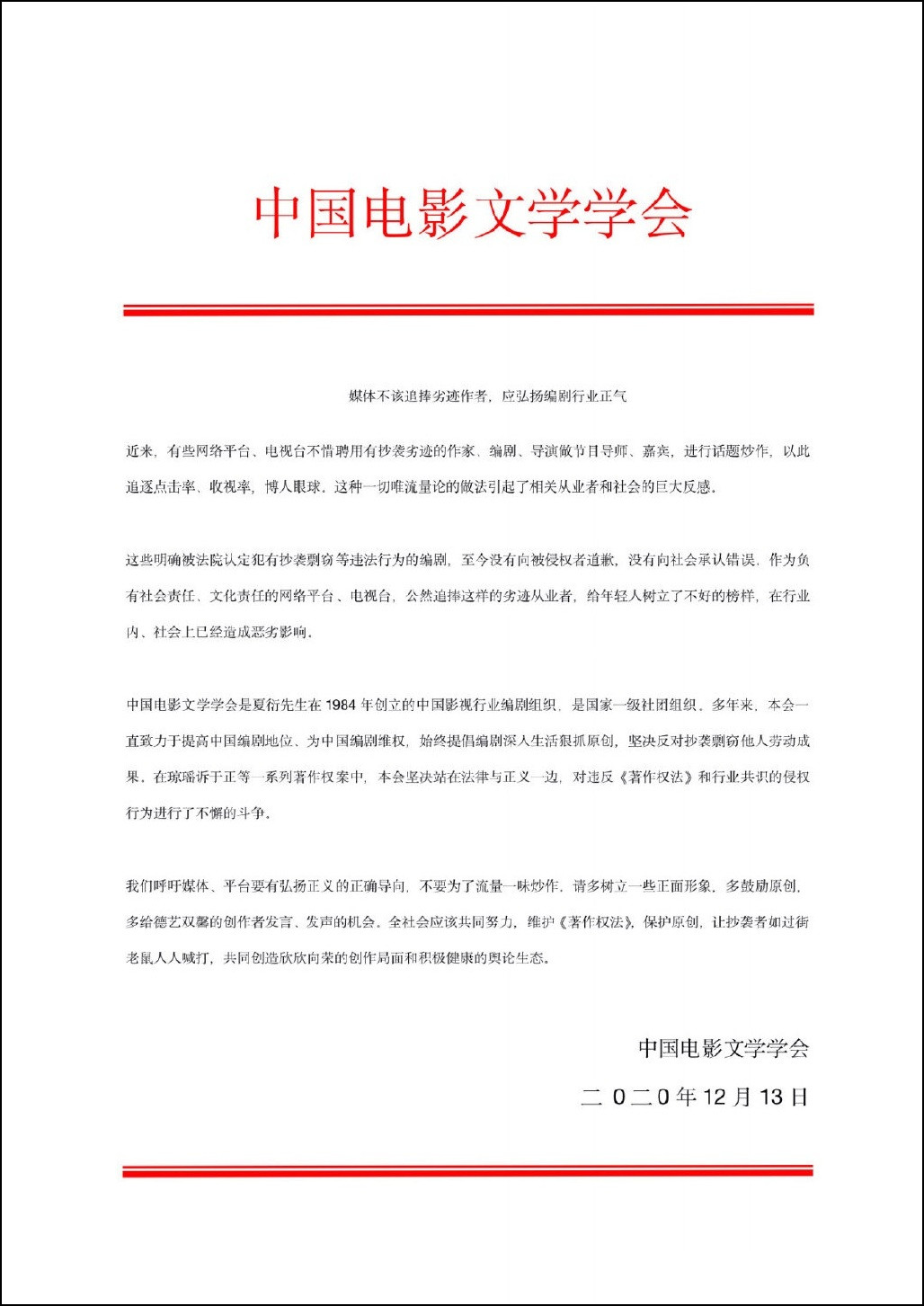 12月14日,中國電影文學學會在官方微博上公開了一篇題為《媒體不該追捧劣跡作者,應弘揚編劇行業正氣》的文章,呼籲電視媒體和網絡平台弘揚正確導向,拒絕聘用有抄襲劣跡的作家、編劇、導演做節目導師、嘉賓。