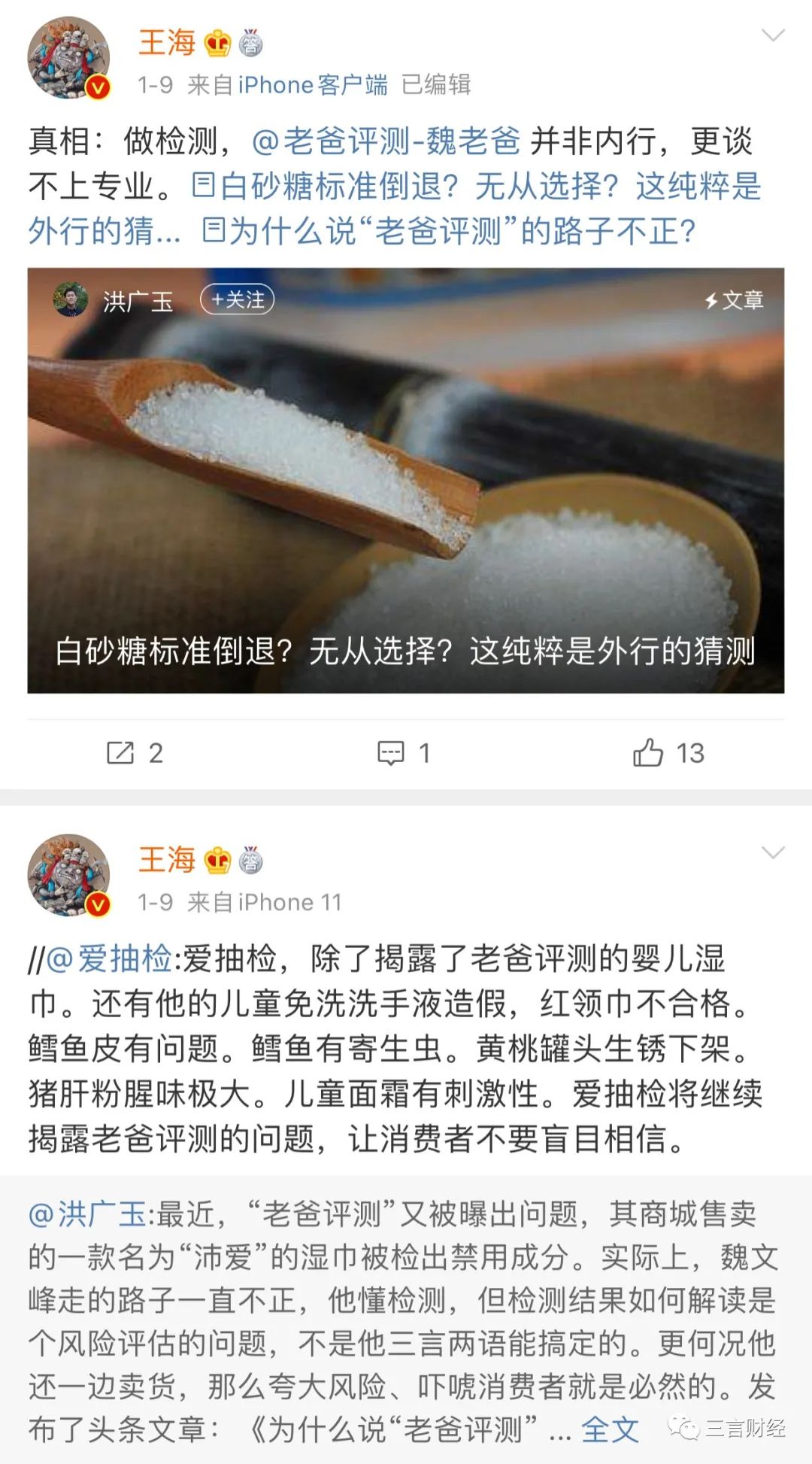 “愛抽檢”實名懟“老爸評測”的事情,還獲得了“職業打假人”王海的支持,王海也多次發文批評“老爸評測”。