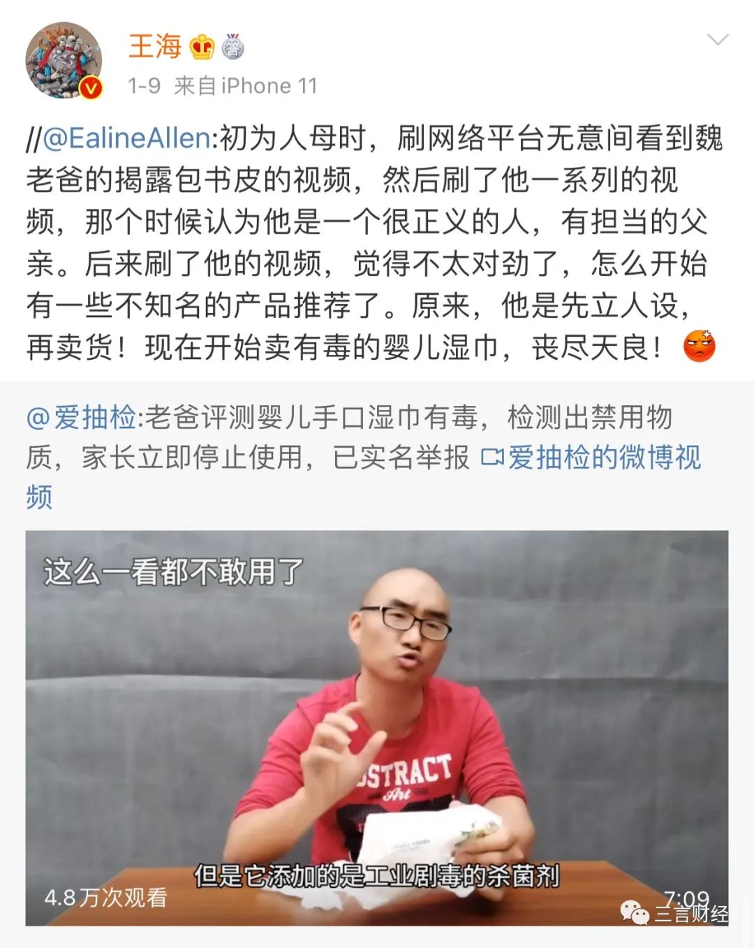早在1月初,“老爸評測”售賣的沛愛濕巾被“愛抽檢”曝光後,王海也在同期關注“老爸評測”的問題。