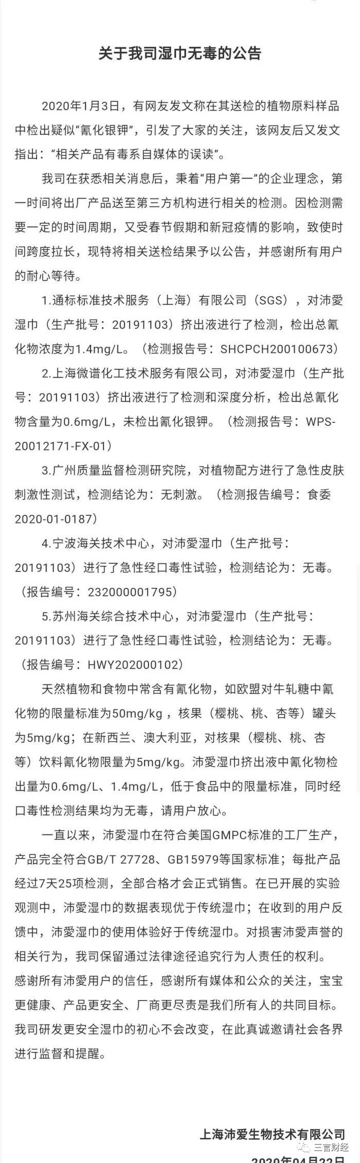 而沛愛公司發佈的聲明同樣稱自己產品無毒。根據該聲明提供的數家檢測機構報告顯示,這款濕巾未檢出氰化銀甲。而檢測出的總氰化物含量為0.6-1.4mg/L。同時,檢測報告還顯示植物配方急性皮膚刺激性測試結果為無刺激。