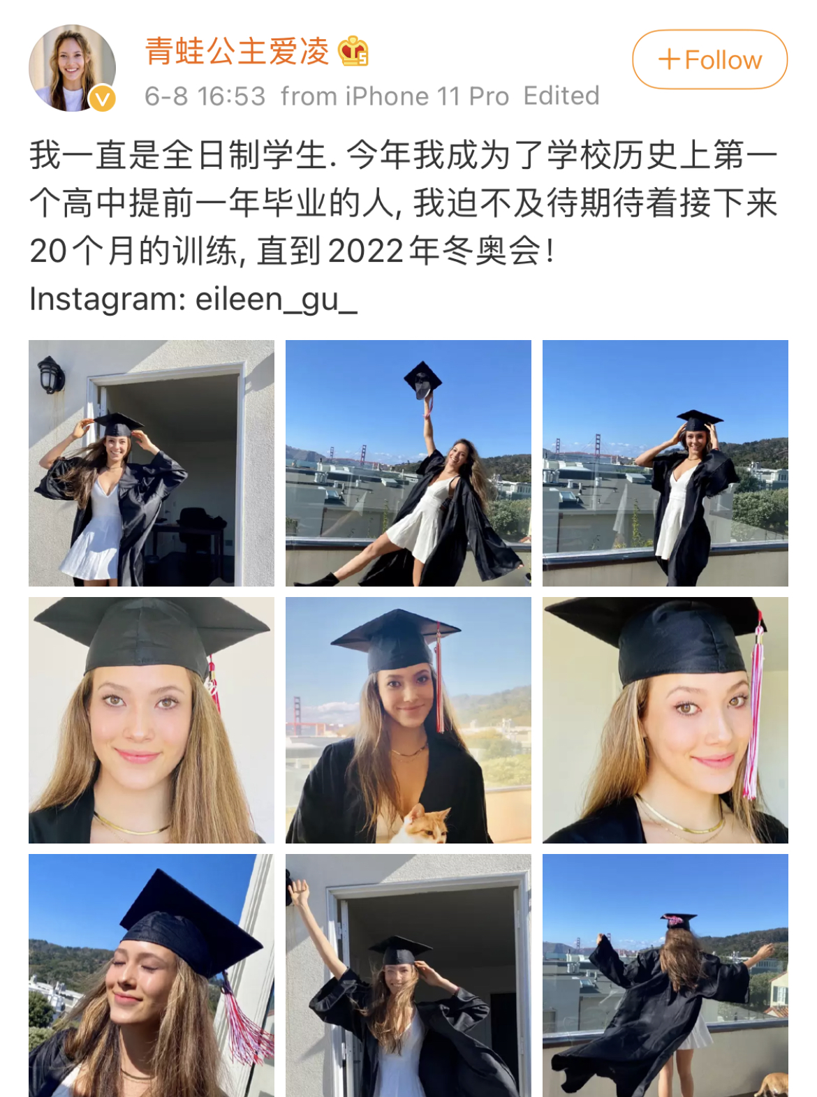 12月12日,谷愛凌在微博(@青蛙公主愛凌)和Instagram(@eileen_gu_)分享了自己被斯坦福大學錄取的喜訊。