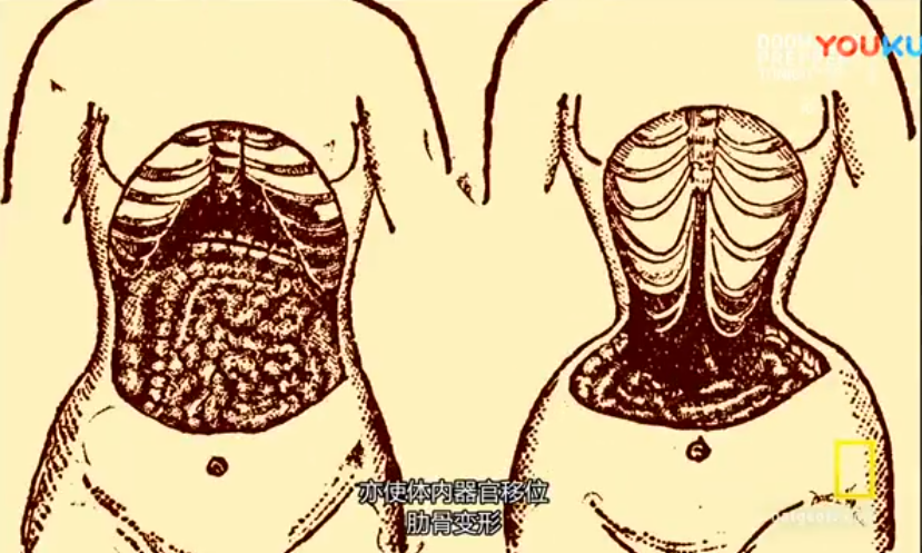 這種塑身衣最早以鯨骨製成,後來換成鋼筋、橡膠,通過外力作用,將身體拗成細腰豐臀,美則美矣,卻很容易導致呼吸不暢,甚至器官移位,肋骨變形。