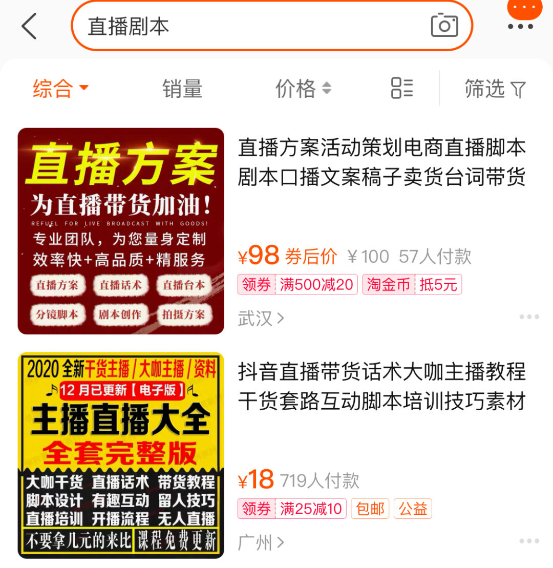 哪裏有需求,哪裏就有服務。網視互聯(ID:wxs360)發現,在淘寶上搜索“直播劇本”,關於劇本訂製服務的商家隨處可見。