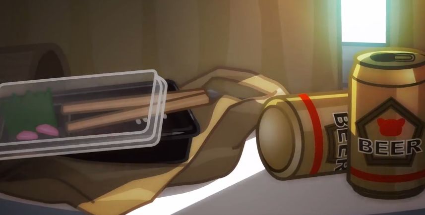 清晨的陽光照進房間,照亮了烈子房間內堆積的外賣便當盒和空啤酒罐,看得出屋主烈子的夜生活非常頹廢封閉,日復一日與外賣盒子為伴。