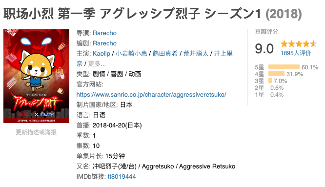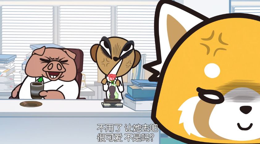 其實動畫裏也有同樣題材的作品,比如三麗鷗公司出品的**《職場小烈》**這部動畫。和大名鼎鼎的網飛公司合作的《職場小烈》,講述了一隻名叫烈子的小熊貓外形職場女性的真實日常。