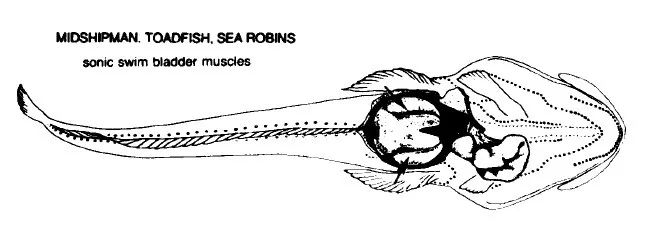 蟾魚的聲音並不是從喉嚨裏出來的,它的發聲器官在身體更深處——魚鰾及其周圍的發音肌。