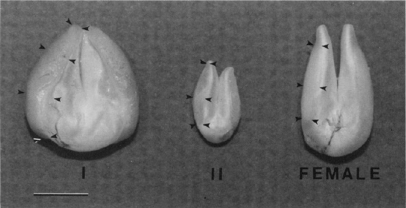 Ⅰ型(左)、Ⅱ型(中)雄蟾魚和雌蟾魚(右)的魚鰾和發音肌(箭頭處)| 圖源:Bass, A. H. (1990)