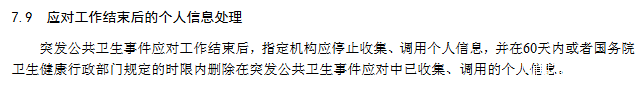 突發公共衞生事件應對工作結束後,指定機構應停止收集、調用個人信息,並在60天內或者國務院衞生健康行政部門規定的時限內刪除在突發公共衞生事件應對中已收集、調用的個人信息。