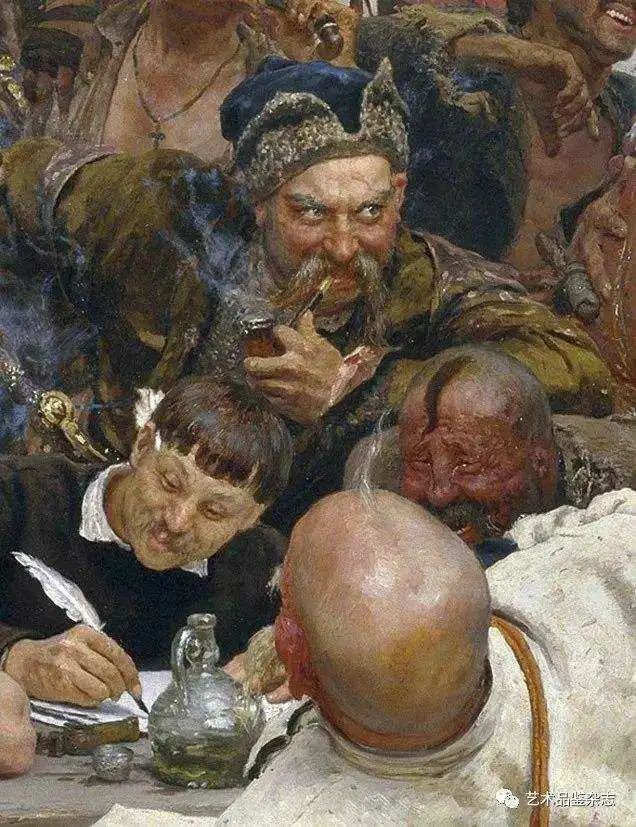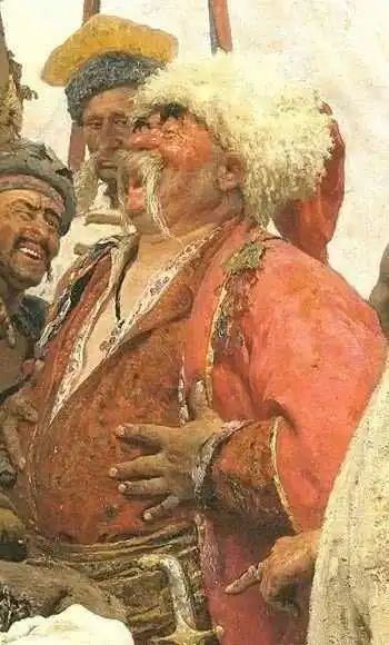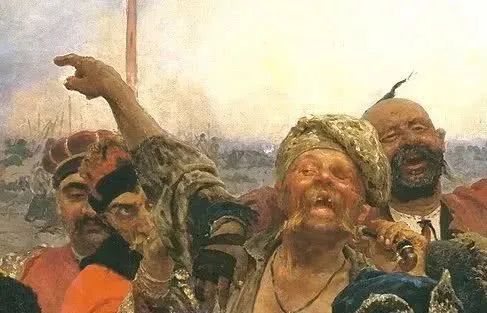 我最愛的油畫之一,就是俄國最偉大油畫家列賓的作品,畫的是哥薩克首領們在給奧斯曼蘇丹穆罕默德四世的勸降書回信,也叫《扎波羅什人寫信》,信中極盡嘲諷和辱罵,可以説是祖安來信,不夠温文爾雅。