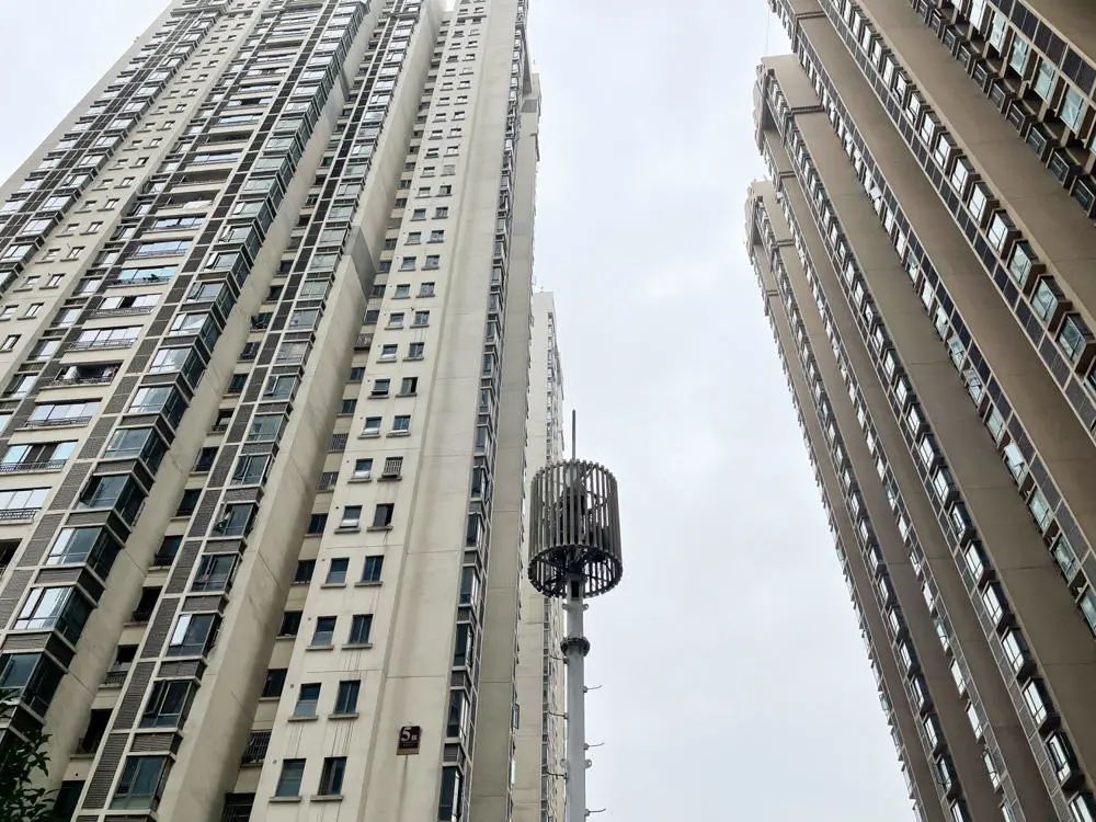 **但在“魔幻”的花果園,地面基站的作用受到了客觀條件的限制。**它最受制於樓間距:我們在小區的通道里發現的一個小型宏基站,工作人員介紹,它的天線角度只能覆蓋兩個樓之間的狹窄通道和周圍十幾層樓高度的住户。而在開闊地帶,這樣典型的基站能覆蓋直徑幾百米的區域。