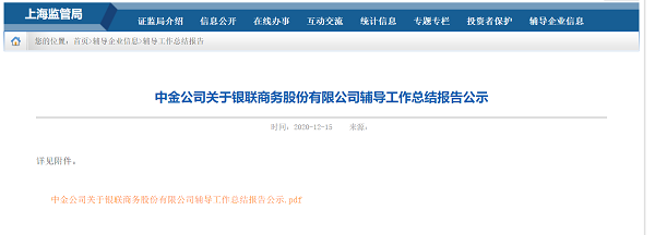 日前,上海證監局官網公示《中金公司關於銀聯商務股份有限公司輔導工作總結報告》(以下簡稱“《報告》”)。根據《報告》,銀聯商務已達到輔導計劃的目標要求,接下來將向上交所提交科創板申報材料。